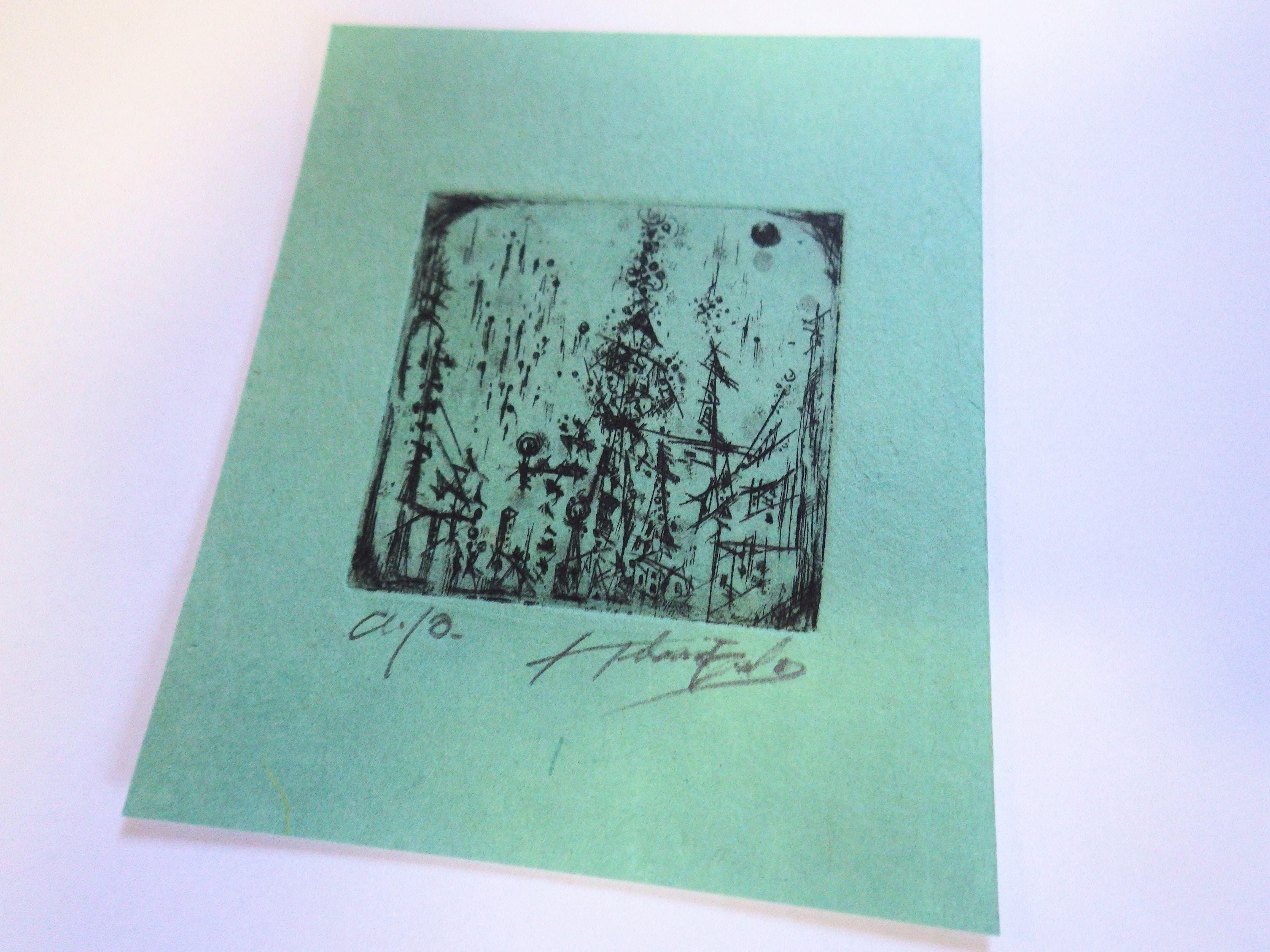 銅版画 月桃紙(青) 『雨降る街』